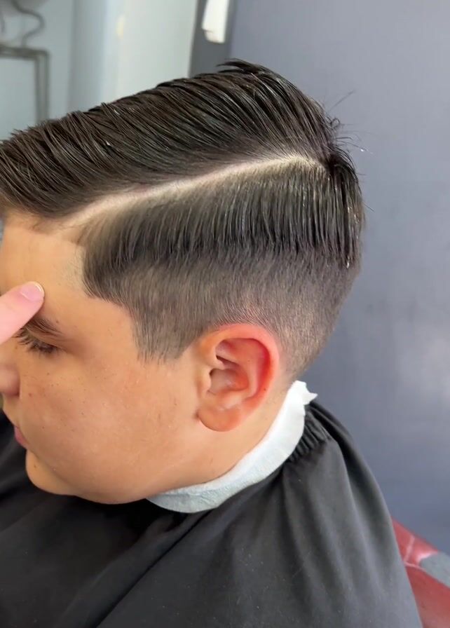 - ". A person’s finger is touching the side of a boy’s forehead while a barber’s cape is on him. The boy has a side part haircut and the hair is wet. A counter with barbering supplies is reflected in a mirror in the background." by FM-1fn4g1, licensed under CC BY 4.0