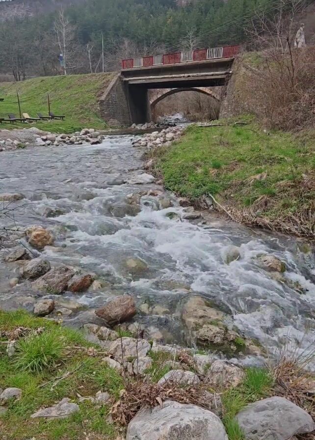 shallow, rocky stream flowing under a small bridge in a natural setting. The water is clear and moves quickly over the stones, creating white water. The bridge is made of concrete and stone with a red and white railing. Green grass and some small plants cover the stream banks. In the background, there is a steep, rocky hillside covered with trees under an overcast sky. On the stream bank to the left, there are picnic tables in the grass. The camera remains still throughout the video.