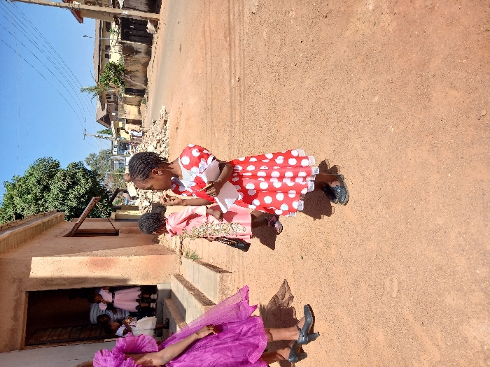 The image displays an outdoor street scene in Jos, Nigeria, under clear daylight, casting distinct shadows. The foreground is an unpaved, reddish-brown dirt surface. To the far left, the lower torso and legs of an individual are partially visible, clad in a flowing, ruffled purple dress and dark, high-heeled shoes. Slightly right and behind this, a young female child with dark braided hair stands, wearing a light pink patterned dress and carrying a small dark handbag. Centrally positioned, another young female child with dark braided hair wears a red dress with white polka dots and dark, closed-toe shoes. She holds a small white booklet in her left hand, with her right hand's fingers near her mouth. In the mid-ground on the left, a light brown concrete building with a dark, recessed entrance is visible. Two concrete steps lead to this entrance, where several young children are gathered; one child in a white dress and another in a pink dress are discernible among them. Adjacent to the building and on the right side of the unpaved road, a substantial pile of concrete rubble or demolition debris is present. The background features an unpaved road extending into the distance, bordered by various single and multi-story concrete buildings, some with perimeter walls. Utility poles and overhead power lines traverse the upper mid-ground. A large green tree is visible behind the central building. The sky is clear and blue.