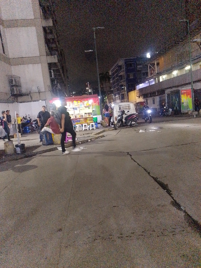 The image depicts a nighttime urban street scene in Caracas, Venezuela. The foreground features an asphalt road with prominent linear cracks, leading to a concrete curb on the left. On the midground-left, a brightly illuminated street food kiosk, characterized by red, yellow, and green panels, displays various items and is flanked by white plastic stools. Several individuals populate the scene. In the central midground, one person wearing dark clothing (black shirt, black pants, white shoes) is captured in motion, stepping forward with their right leg raised, positioned near another individual seated on a blue plastic crate. This seated person is wearing a reddish-brown shirt and light-colored pants, facing right. Further left, near the kiosk, multiple people are visible, including one in a yellow shirt and another in a black shirt. To the right of the kiosk, a white van is parked at the curb, with two women standing in close proximity. A black motorcycle is parked adjacent to the van. Further down the street on the right, a motorcycle with its headlight illuminated is in motion, carrying a helmeted rider. Another parked motorcycle is visible further in the background on the right. The environment includes a tall, multi-story, light-colored building with visible exterior air conditioning units dominating the left side of the frame. In the background on the right, various city buildings, including a distinct blue structure, are partially visible under a dark night sky. Multiple streetlights provide overhead illumination throughout the area. The overall scene suggests an active commercial or residential street.