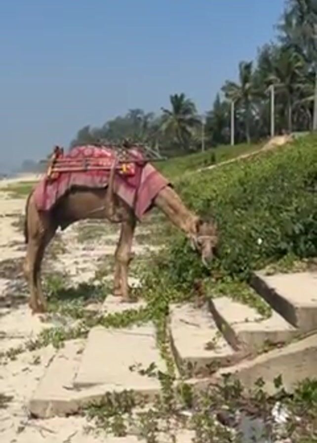 The video depicts a dromedary camel adorned with a red and pink saddle resting on a sandy beach adjacent to a grassy area. The camel is actively grazing on the vegetation along the edge of a set of concrete steps. The sky is clear and blue. Palm trees and other foliage are visible in the background along the coastline. The scene appears to be during daylight, with good lighting.