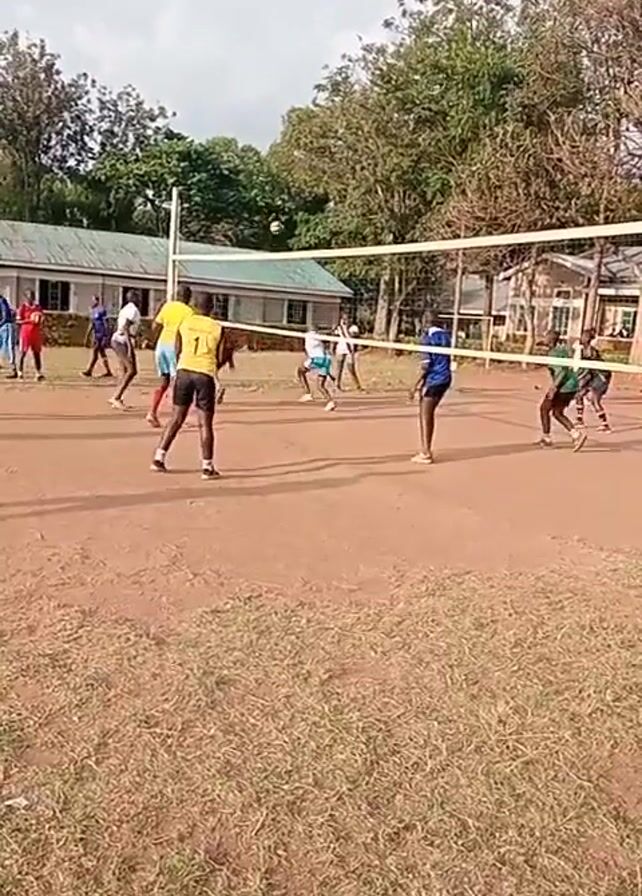 volleyball game taking place on a dirt court, likely outdoors. A net separates two teams. Players wear various color uniforms. The video captures serves, volleys, and movement across the court as the players attempt to hit the ball over the net. In the background there are trees, grass, and buildings.