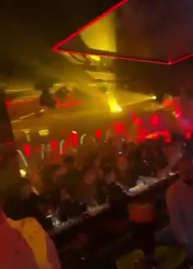 crowded nightclub with red and yellow lights, a bar, and people dancing. Some people are standing at the bar, while others are on the dance floor. The club appears dimly lit, with bright lights adding to the party atmosphere. A hookah is visible in the foreground.