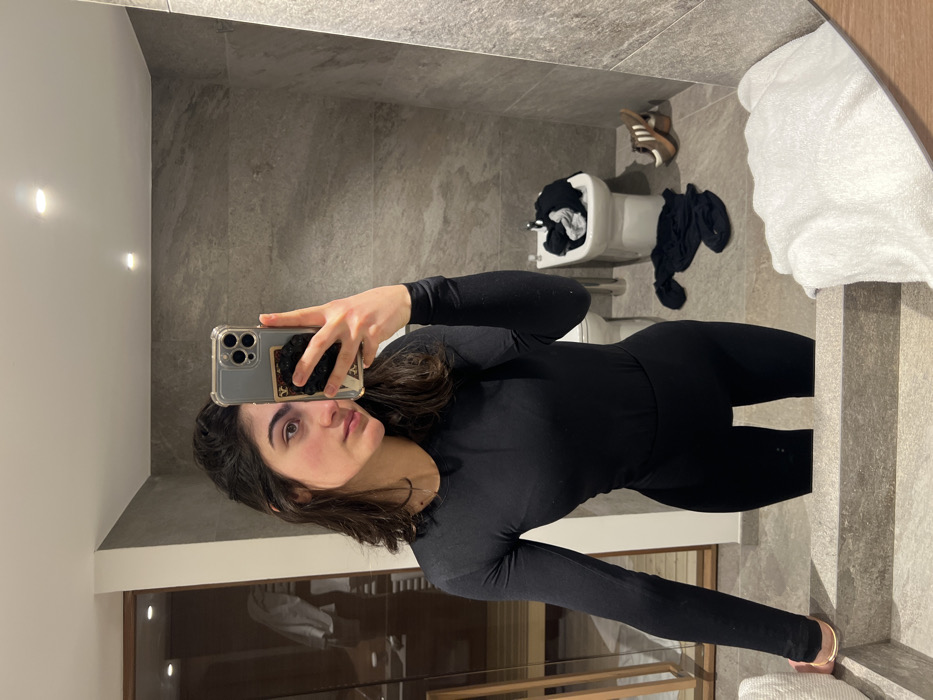 A woman poses in a bathroom mirror, taking a selfie with her phone. She wears a form-fitting, long-sleeved black outfit. The bathroom has gray tiled walls and a white toilet with clothes piled on top. A pair of sandals are nearby. A crumpled white towel sits on a ledge in the foreground. Lower in the mirror's reflection is a glimpse of a wood-framed structure, partially obscured by a white towel.
