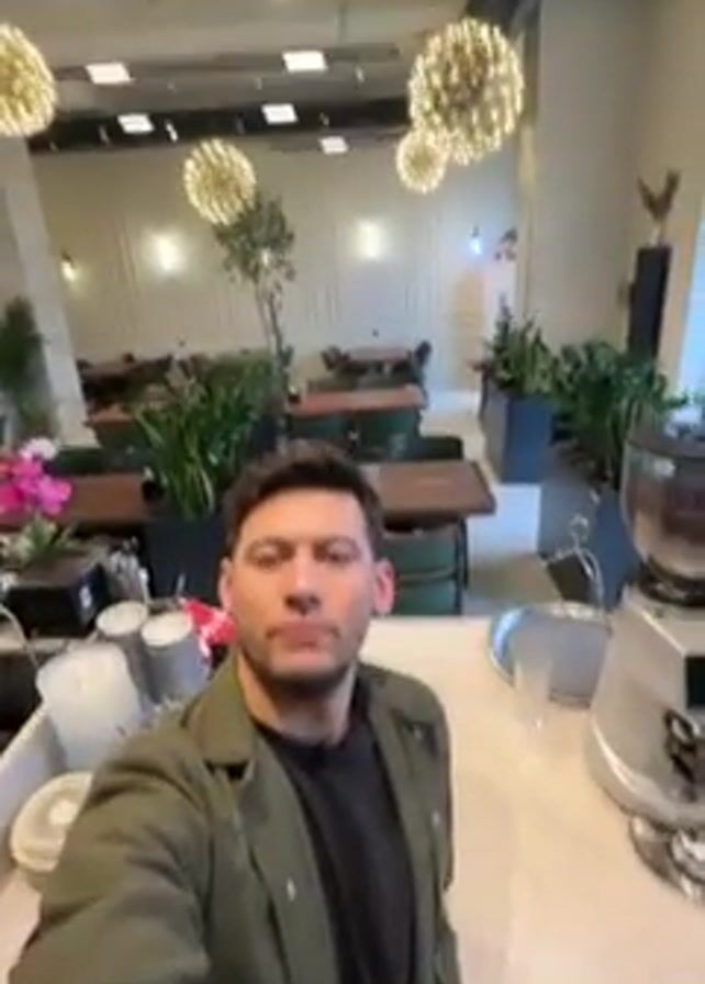 A man stands behind a counter in a restaurant, holding a camera. The camera pans to show the restaurant interior, which has a modern design. There are wooden tables and chairs, potted plants, and unique spherical light fixtures hanging from the ceiling. A coffee grinder and espresso machine are visible on the counter. The restaurant appears empty except for the man.
