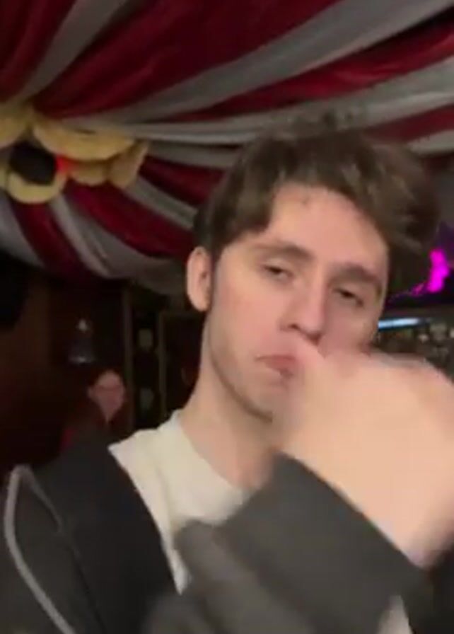 A young man in a white t-shirt and black hooded sweatshirt is standing in what appears to be a crowded, dimly lit club. The club is decorated with red and white striped fabric draped across the ceiling in a circus-tent style. Loud music is playing, and people are visible in the background. The man looks directly at the camera with a slightly pensive expression. At the beginning, he makes a dismissive gesture with his hand and then lowers it. He briefly looks away before returning his gaze to the camera.