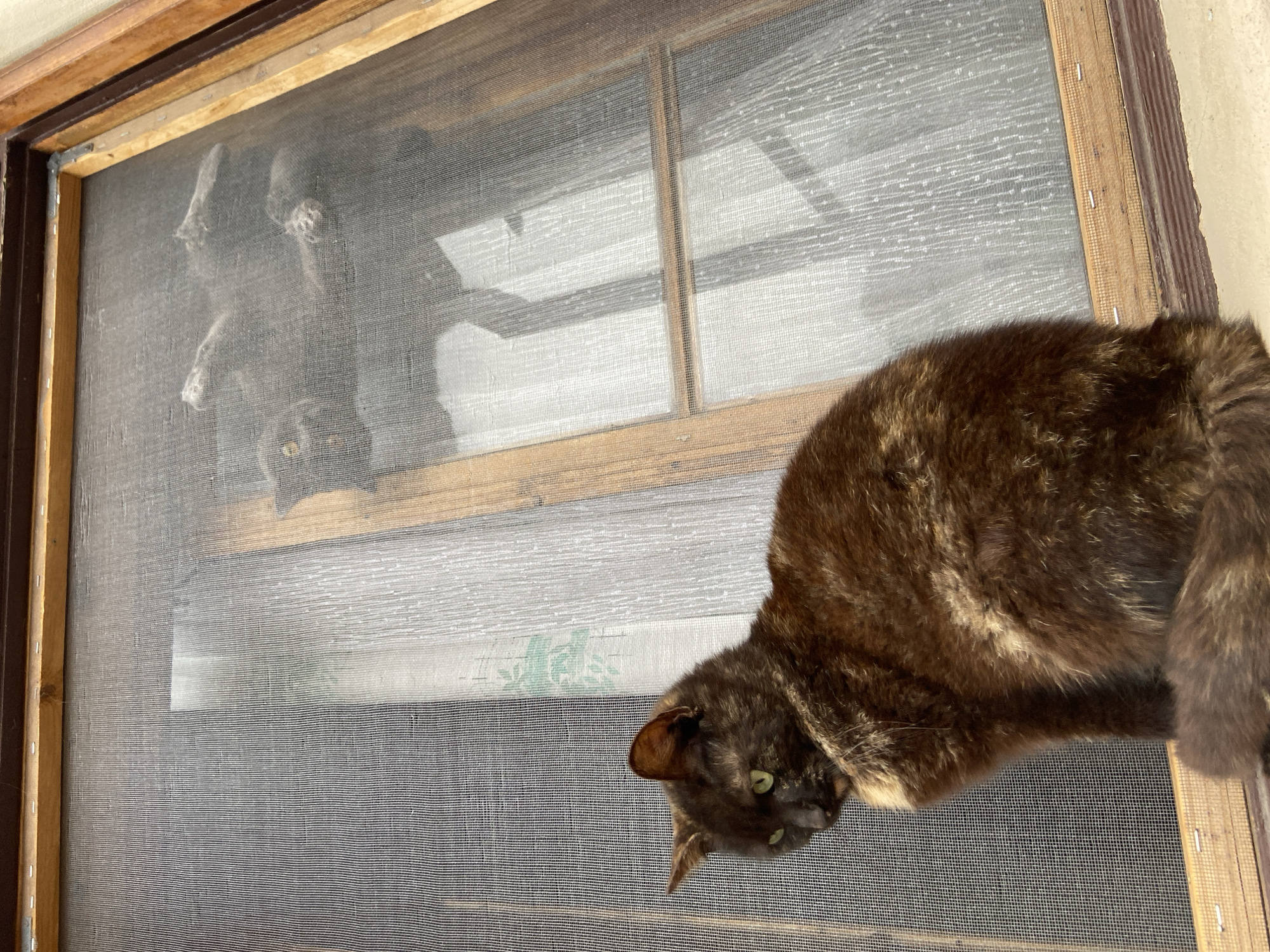 A tortoiseshell cat, primarily dark brown with lighter brown and tan patches and distinct green eyes, is positioned in the foreground, facing left and slightly downwards. It sits on a light-colored windowsill or ledge, with its body partially visible from the head to the base of its tail. The background is dominated by a light gray mesh window screen, secured within an aged, light brown wooden frame, visible at the top, right, and bottom edges. A reflection of a dark-colored cat, oriented upside down, is visible in the upper central portion of the screen, showing its face and paws. Behind the screen, an interior view reveals white curtains, one section adorned with a faint green pattern. The scene is located in the city of Mindia, Bulgaria.