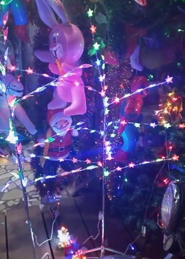 several Christmas trees, along with other decorations, including a pink rabbit, Santa Claus, and Spiderman figures. The trees and decorations are covered with colorful lights, creating a festive atmosphere. A motorcycle is partially visible in the foreground. The ground is covered with tiles and wood. Music is playing in the background.