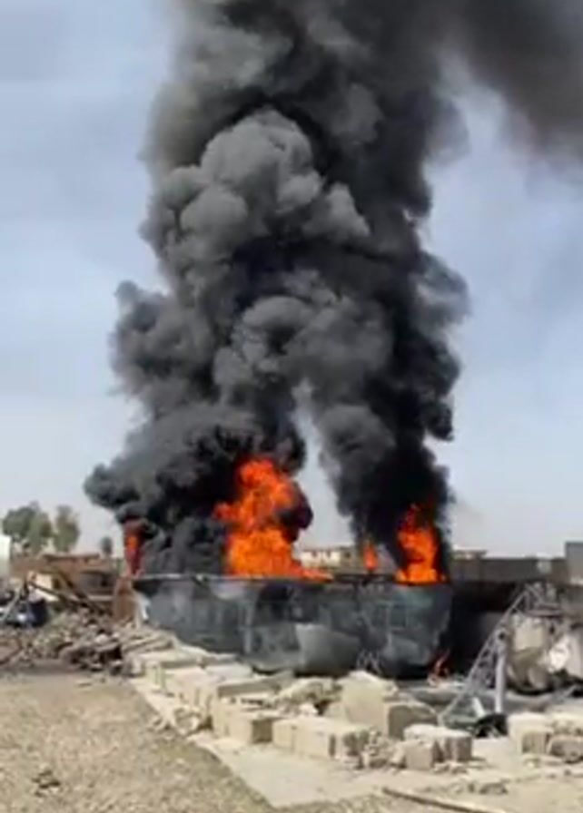 large fire in an outdoor area. Flames are visible rising from what appears to be the remains of a structure, with a massive plume of thick black smoke billowing upwards. The surrounding area is barren, with debris and rubble scattered around. The sky is overcast, and there's no visible indication of attempts to extinguish the fire or the presence of people actively fighting it.