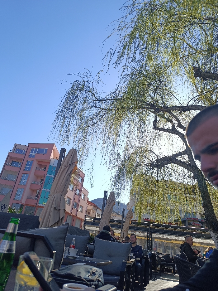 The image displays an outdoor cafe seating area in Asenovgrad, Bulgaria, under clear blue skies on a sunny day. A large weeping willow tree with light green, cascading foliage occupies the upper right and central portions of the frame, through which bright sunlight is visible. In the background to the left, a multi-story building with a prominent pink facade and blue-tinted windows is visible, along with other urban buildings and distant mountains. The cafe area is furnished with dark grey cushioned lounge-style seating and small tables. Several large, beige outdoor umbrellas are present in a folded, upright position. Approximately five individuals are visible, seated at the tables. In the immediate foreground on the right, the upper portion of a male's head and face is visible, showing short dark hair and stubble, looking towards the scene. Further back, a male subject with dark hair and a beard is seated, facing slightly right. Other patrons are less distinct, visible in the background seated at tables. On a foreground table, a green glass bottle, a clear glass containing ice and a lemon wedge, a white ceramic coffee cup, and a dark-colored pouch are visible. A red Coca-Cola bottle is also present on an adjacent table. The overall scene is brightly illuminated by direct sunlight.