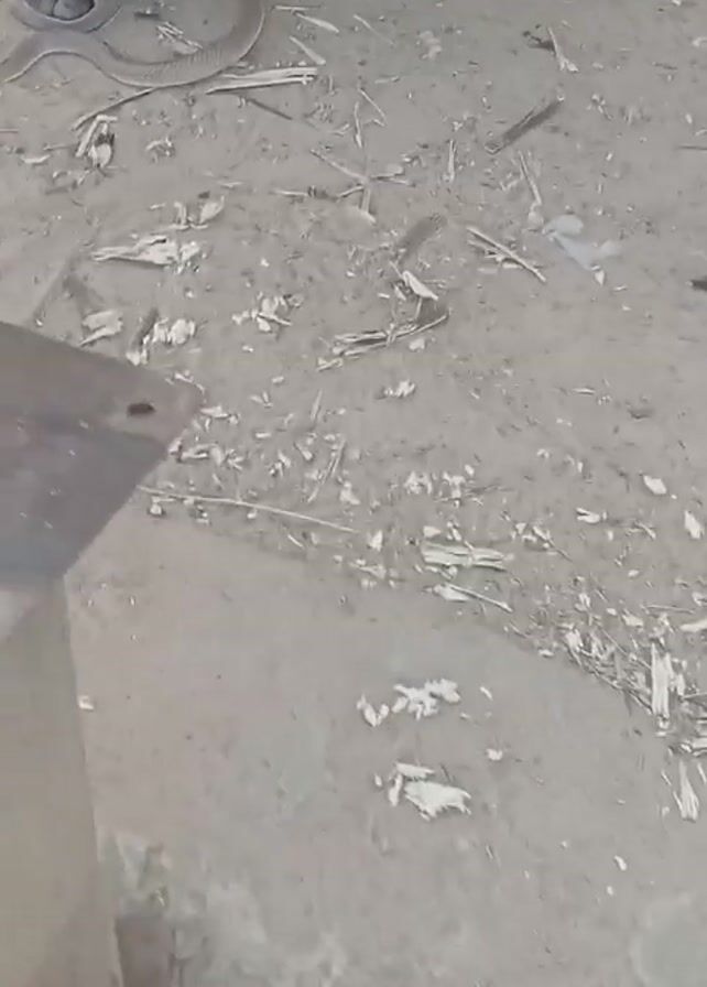 A person crouches on sandy ground with scattered debris, touching a snake. The snake is light brown and appears to be wrapped around the person's sandal-clad foot. The person is wearing a blue shirt and dark pants, and they use their hand to guide the snake. A metal object sits on a wooden base nearby. The background consists of a partially visible wall.