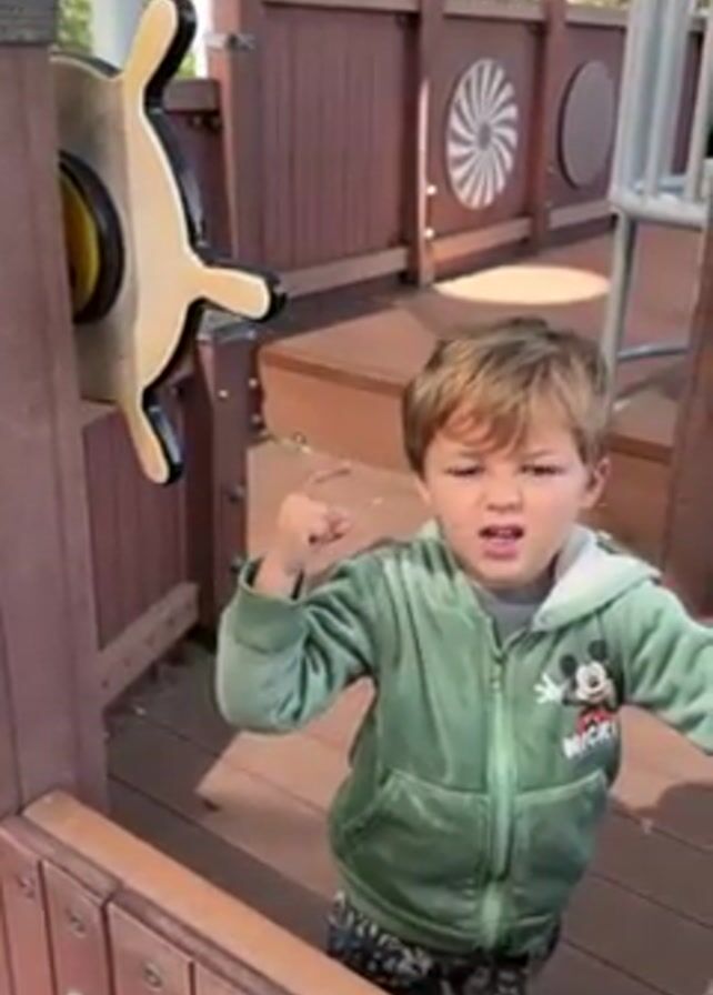A young boy is standing on a wooden platform in a playground. He is wearing a green Mickey Mouse hooded sweatshirt and patterned pants. To his left is a wooden structure with a ship's wheel. The boy makes a hand gesture with two fingers on his forehead and says "Ya, capitan pirat." The playground has a brown wooden and white theme, and some sunlight is visible in the background.