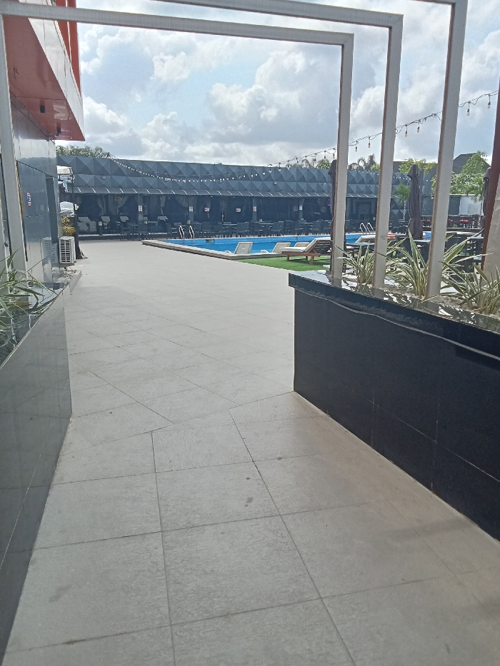 view from a doorway looking out towards a swimming pool. The doorway is framed by a white metal structure. There is a black wall on the left side of the image and a black wall on the right side of the image. The pool is surrounded by a black tiled area. The pool is blue and there are some lounge chairs and tables in the surrounding area. The ground is tiled. There is a small patch of green grass visible to the left of the pool. The scene is an outdoor area located in the city of Ujevwu, Nigeria, at the coordinates latitude: 5.472, longitude: 5.817. There are no people visible in the image.