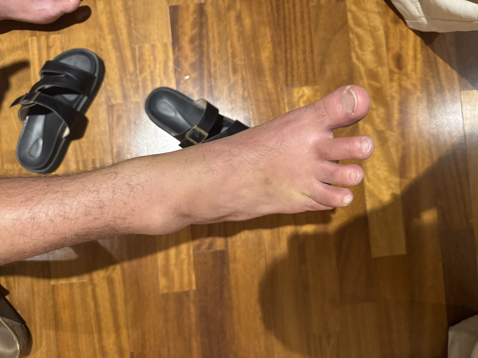 The image presents an overhead view of a human left leg and foot resting on a polished wooden floor, consistent with laminate or hardwood. The leg is covered in fine hair. The foot and ankle exhibit significant, visible swelling and a reddish-pink discoloration, particularly prominent over the dorsum of the foot and around the ankle joint, indicating inflammation. The toenails are present; the nail on the great toe appears to have a slightly irregular shape and lighter coloration near its base. Two black, two-strap sandals with dark buckles are situated on the floor to the upper right of the primary subject, appearing to be discarded footwear. A partial view of a brown shoe is visible in the upper left quadrant of the frame. Shadows are cast on the wooden surface, suggesting illumination from an overhead light source. This scene is located in George Town, Malaysia.