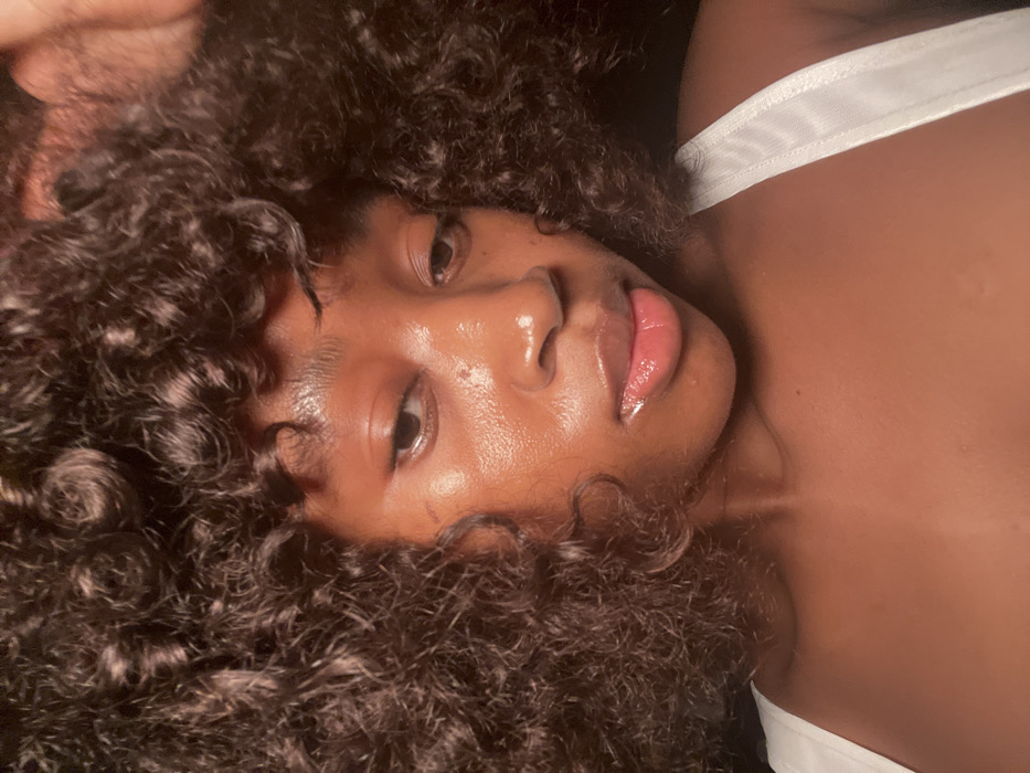 A young person with dark skin, curly dark hair, and glossy lips, gazes directly at the camera. Light reflects off their forehead, nose, and cheek. Their hair surrounds their face and covers a portion of their upper body. A white strap is visible on their shoulder. The image is slightly rotated, and the background is dark.