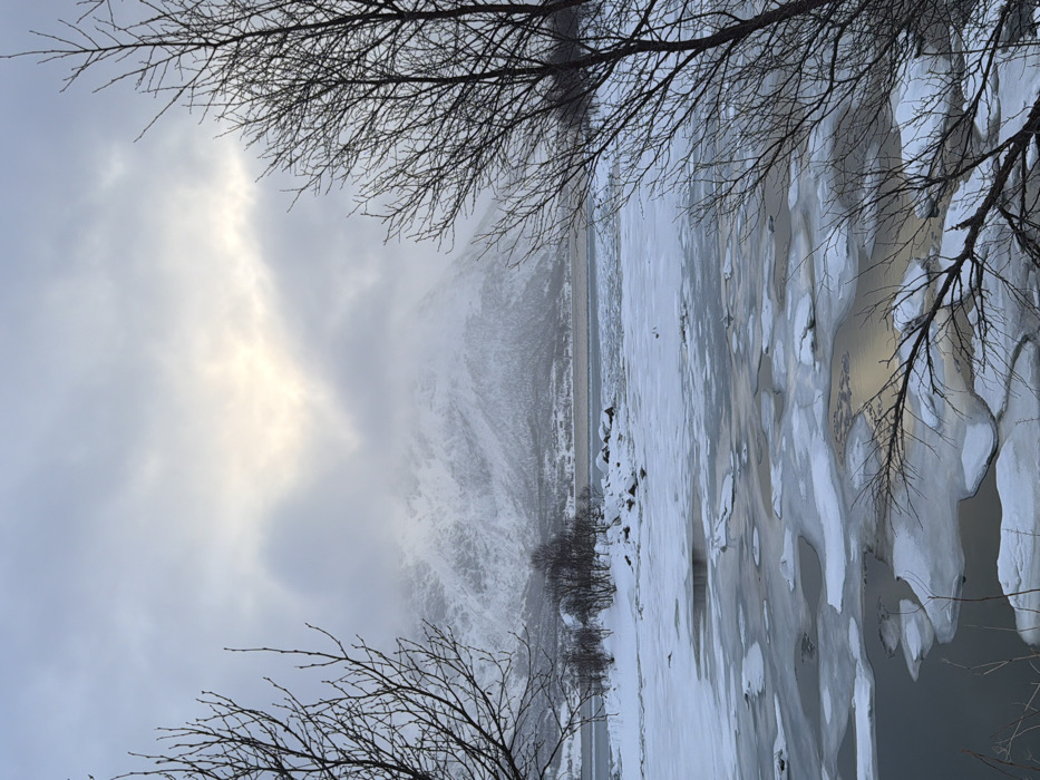 This image depicts a wintry landscape in Laupstad, Norway. The scene is dominated by a partially frozen body of water, likely a fjord, in the midground. Numerous irregular ice floes, predominantly white with some showing blueish tints, are scattered across the water's surface, interspersed with dark, open water sections that reflect the muted sky. In the foreground, bare, leafless tree branches partially frame the view from the left and right sides. On the left midground, a small, snow-covered landmass or island features a cluster of bare trees and exposed rocks. The background is defined by a large, snow-covered mountain range, its upper sections partially obscured by thick, grey clouds or fog. A faint, distant shoreline with minimal signs of human habitation, possibly scattered structures, is visible at the base of the mountains across the water. The sky is overcast and grey, with a brighter, yellowish-white patch of diffused light breaking through the clouds in the upper center-right, suggesting a hidden light source. No individuals or active subjects are present in the scene.