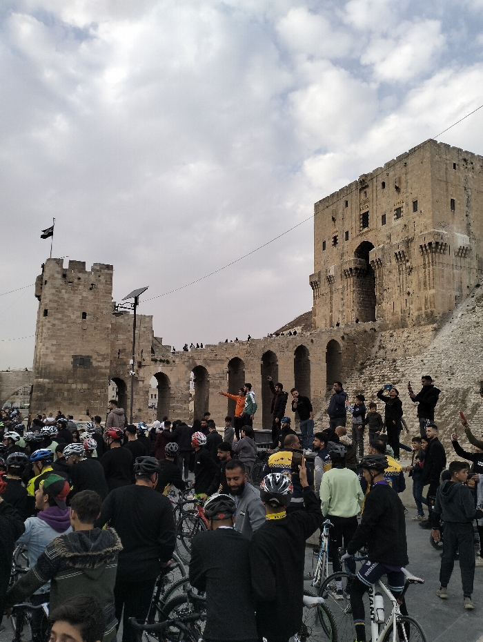 - "A large crowd of people wearing helmets and some with bicycles gathers in front of an ancient stone structure" by FM-4RDN43, licensed under CC BY 4.0