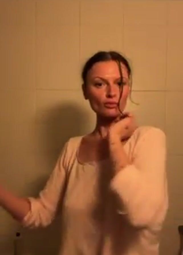 A woman with dark hair pulled back in a bun stands in a bathroom with beige-tiled walls. She is wearing a long-sleeved light pink shirt and black underwear. She adjusts her shirt, poses with her hands on her hips, and then brings her arms to her chest, wrapping them around herself. She briefly looks at her hand as she does this.