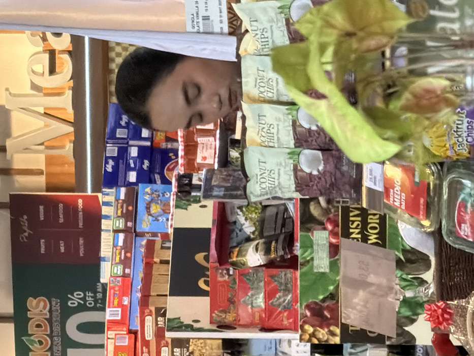 This image depicts an interior scene within a supermarket or grocery store in Benoa, Indonesia, characterized by multiple product displays and promotional signage. A single adult individual, appearing to be female, is partially visible in the mid-ground, positioned behind a product display. She has dark hair pulled back, and her face is shown in profile, looking downwards, with her expression neutral. A vertical white banner on the right partially obscures her, displaying text including "GONGOLA CHOCOLATE VANILLA". The foreground features a partial view of a green and red-leafed potted plant on the right. Below it, clear plastic containers of "Jackfruit Chips" and "FRESH MEDJO DATES" are visible, with a price tag of "25.000" near the dates. Immediately behind these, multiple bags of "COCONUT CHIPS" are stacked prominently. To their left, various packaged items, including red boxes and other grocery products, are arranged on shelves. A brown wicker basket with a red bow is partially visible at the bottom left. The background comprises extensive shelving units filled with various packaged goods. These include stacks of blue boxes, resembling cereal boxes, and other colorful product packaging. Above these, multiple jars of what appear to be jams or preserves are visible. High on the wall, large white letters spell "Mea", likely part of a departmental sign. A green sign on the upper left corner advertises "MODIS" with a "DISCOUNT % 7 - 10 AM". Adjacent to it, a smaller maroon sign lists "Papito" with categories such as "FRUITS," "VEGGIE," "MEAT," "SEAFOOD," "POULTRY," and "FROZEN FOOD." The environment is brightly lit, indicative of an indoor retail setting.