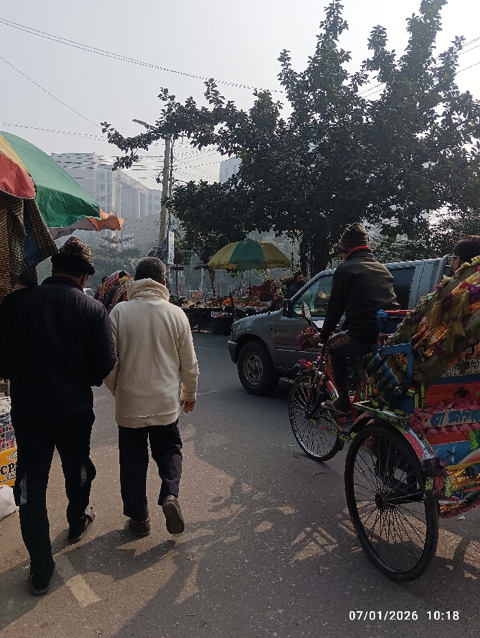 Two men are walking along a street beside a rickshaw. A car is parked nearby, and vendors sell goods under umbrellas. In the background, buildings stand behind bare trees under a bright sky. The date stamp reads 07/01/2026.
