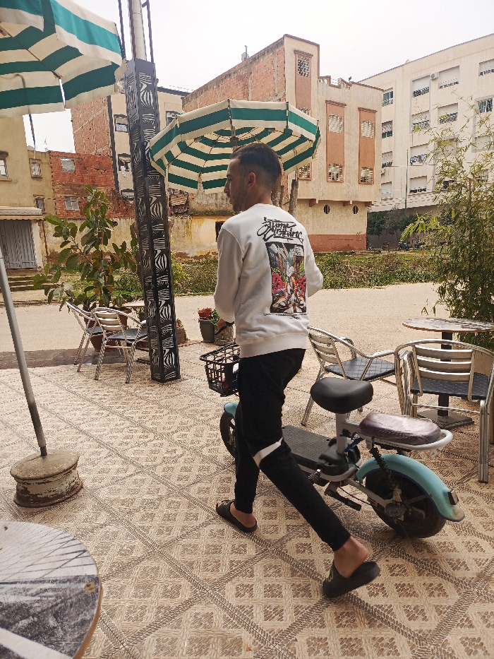 An outdoor scene in Meknes, Morocco, depicts a paved patio area adjacent to an urban setting under an overcast sky. A male individual, seen from the back-right, is walking towards the right of the frame. He wears a white long-sleeved sweatshirt with a multi-colored graphic print on the back, black trousers with a white stripe on the outer seam, and dark slip-on sandals. His right foot is partially lifted, indicating motion. To his immediate right, a light blue electric scooter with a black seat, a small brown rear pad, and a black front basket is parked. The patio floor is covered with light-colored geometric patterned tiles. Within the patio area, several items of cafe furniture are visible: two large green and white striped octagonal umbrellas, multiple metal chairs with slatted seats and backs, and metal tables with round tops. A dark, decorative pillar with an intricate pattern stands in the mid-ground. Planters containing green foliage are also present. In the bottom-left foreground, a circular section of a wooden table with a radial pattern is partially visible. Beyond the patio, an unpaved or sparsely vegetated area with some debris separates the foreground from the background architecture. The background features several multi-story buildings: an older structure with exposed reddish-brown brickwork on the left, a light beige building with brown trim in the center, and a taller, modern building with numerous windows on the far right.