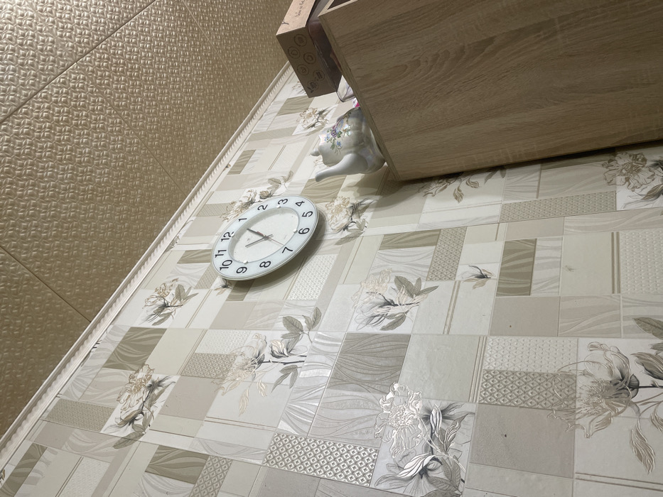 A slightly tilted overhead shot reveals a room's corner. A textured beige wall meets a patterned tile floor. A white, round clock rests on the floor near a white teapot. A wooden cabinet's edge hovers above, suggesting a space beneath it. The tiles are decorated with floral designs and geometric patterns in muted beige and gray tones.