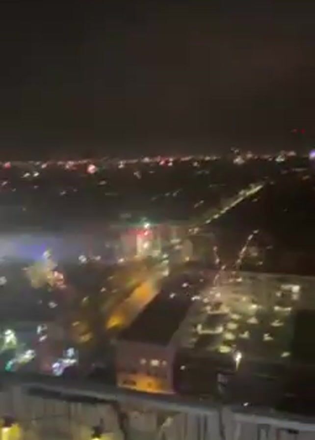 nighttime cityscape with many lights and fireworks. It is shot from a high vantage point, likely a rooftop or high-rise balcony, evidenced by the foreground railing with string lights. Two people with dark hair partially appear in the frame at times. The camera moves slightly, showing more of the city skyline. The overall atmosphere is festive.