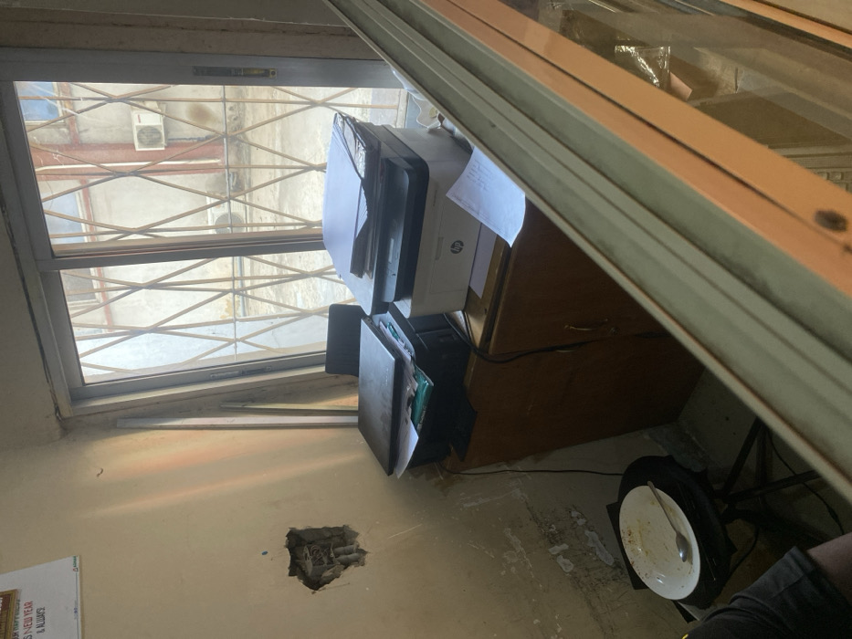A window with metal bars overlooks an outdoor courtyard. Two printers sit on a cabinet to the right of the window. A hole in the wall is visible below the printer on the left. A plate and spoon rest on a small circular table on the floor. Part of a person’s leg is visible at the bottom right corner of the frame. The interior is dimly lit and appears cluttered.