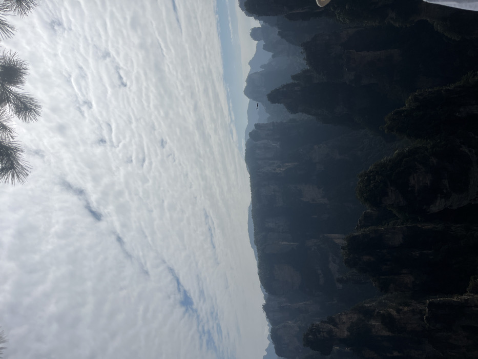 A landscape view presents towering rock formations cloaked in shadowy foliage, receding into hazy distance. Overlying, a sky filled with striated cloud patterns dominates the left side of the composition, showcasing soft grey tones and hints of blue. An impression of altitude and dramatic terrain is conveyed. Pine needles appear on the left of the image.