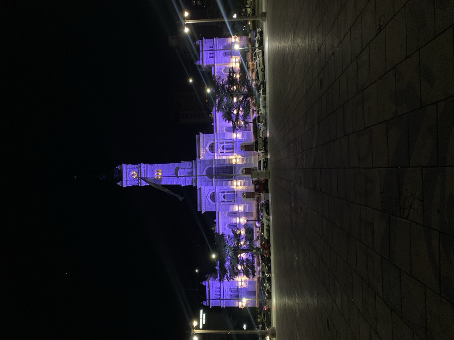A tall building with a clock tower is illuminated in purple light at night. The building is located next to a paved walkway. There are vehicles parked in front of the building and trees scattered in front. The sky is dark. Street lights are visible along the walkway.