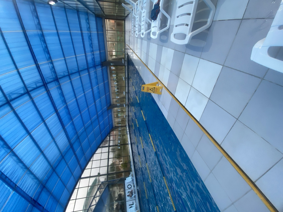 - "An indoor swimming pool sits beneath a blue, arched roof structure" by FM-33abC2, licensed under CC BY 4.0