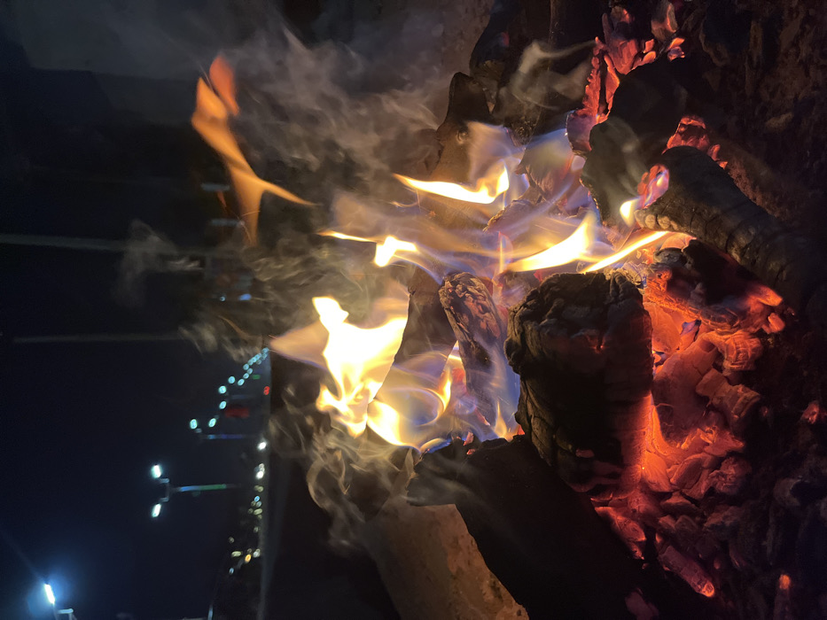 A close-up view captures the vibrant essence of a crackling campfire. The wood is charred black, glowing with intense red embers and swirling, ethereal blue and yellow flames. Wisps of smoke rise, blending with the darkness. A blurred urban background hints at streetlights and building lights adding contrast to the fiery scene.