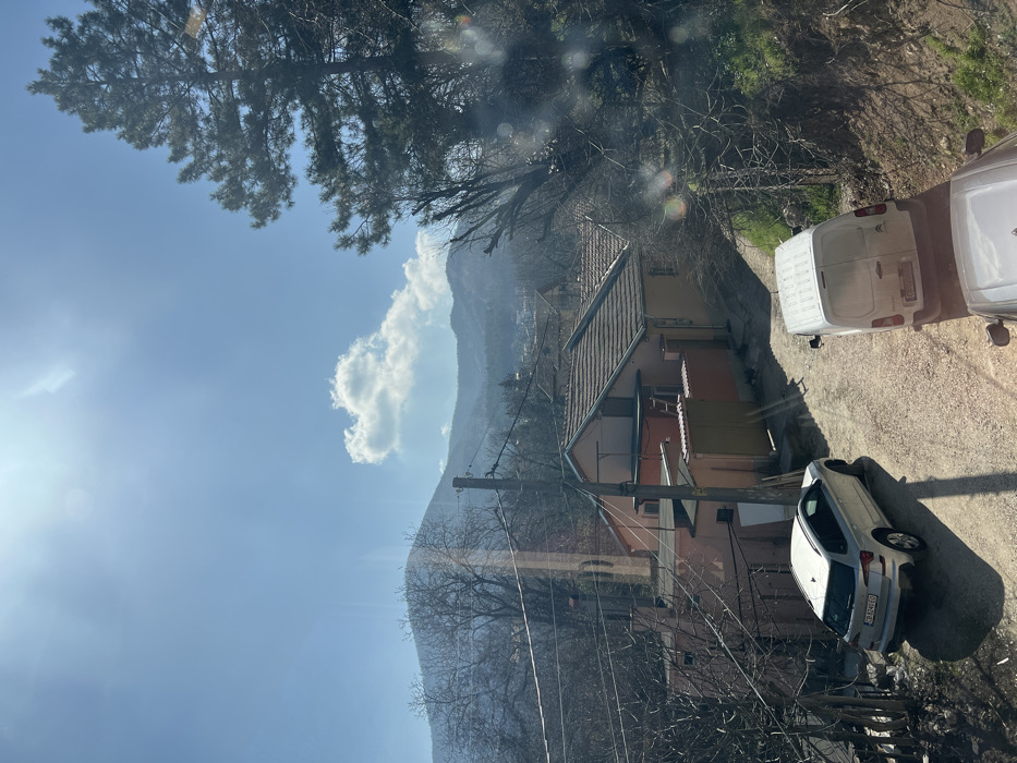 An overhead view captures a residential scene in Markovo, Bulgaria, under a clear, bright blue sky with a few scattered cumulus clouds and significant lens flare. The image depicts a sloping, unpaved dirt and gravel road winding through a village setting, bordered by houses and sparse vegetation. In the midground, several single and two-story houses with reddish-brown tiled roofs are visible. One prominent house, colored pinkish-beige with an orange-brown extension, has a ladder leaning against its exterior wall. Utility poles with numerous electrical wires crisscross the scene, connecting to various structures. The surrounding environment features mostly bare deciduous trees, indicative of late winter or early spring, with a tall, dense evergreen pine tree dominating the upper right side of the frame. In the distance, multiple layers of mountains with sparse tree cover rise under a hazy sky. At street level, three vehicles are present. On the left side of the road, a silver or light-grey SUV, possibly a Skoda Kamiq, with a Bulgarian license plate (partially visible as "CB 240**"), is parked facing away from the viewer. On the right side, a white commercial van, with its rear doors visible, is parked also facing away. The front hood and side mirrors of a third, silver-colored vehicle are visible in the bottom right corner, facing towards the viewer. Long, distinct shadows are cast by the vehicles and buildings, suggesting a high sun angle from the upper left. No individuals are visible in the scene.