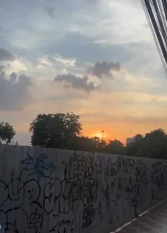 The video depicts an outdoor scene during sunset. The sky transitions from light blue to orange, with scattered clouds. A row of trees and a distant building are silhouetted against the sunset. A long, gray, corrugated metal fence covered in graffiti runs along a sidewalk. A motorcycle carrying two people passes in front of the fence. Overhead, electrical wires are visible.