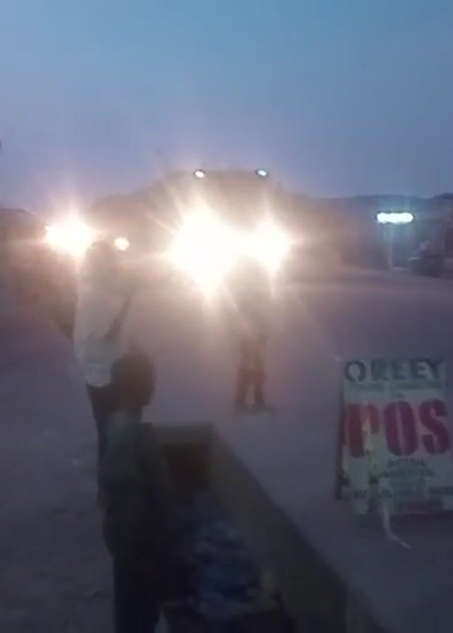 Here is a detailed description of the video: The video shows a street scene at dusk. In the foreground, there are three people standing by the roadside next to a drainage ditch. A sign for "OREEY Phone Charging & POS" stands nearby, advertising mobile network services. A large, blue dump truck with bright headlights passes along the road, obscuring the figures. As the truck moves on, two motorcycles also pass by. The background shows a residential area with various buildings, some lit with artificial lights. The overall scene suggests a bustling roadside area during the early evening.
