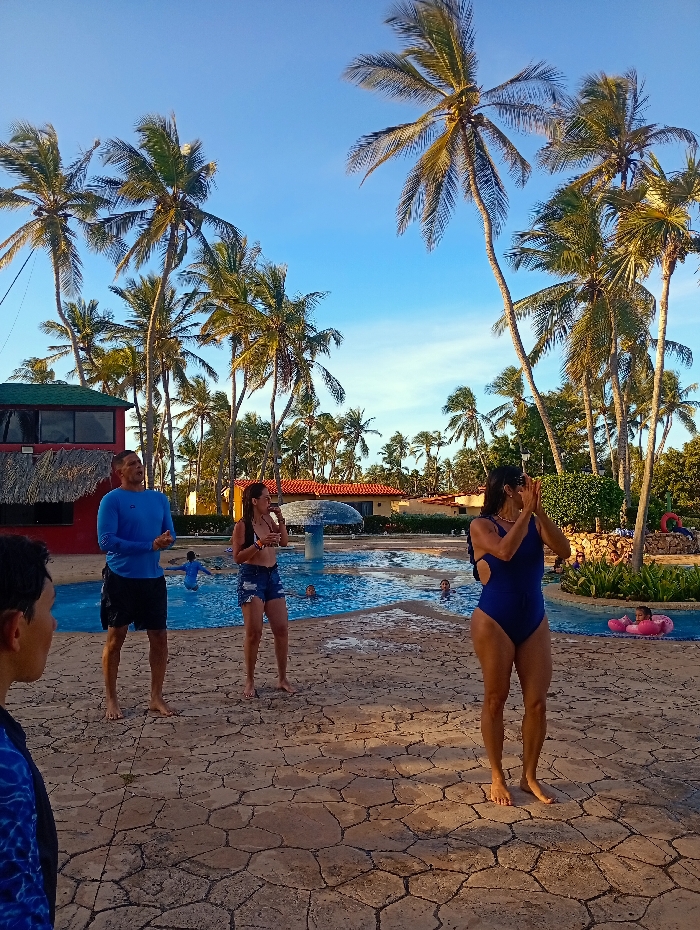 This image depicts a leisure scene at a resort in Playa El Agua, Venezuela, under a clear blue sky, likely in the late afternoon. The foreground features a paved area constructed from irregular, tan-colored stones. A person's upper left profile is visible on the far left, wearing a blue and white patterned shirt, looking towards the right. In the midground, three adults stand barefoot on the paved area. From left to right: a man wearing a blue long-sleeved shirt and dark shorts, with hands clasped in front; a woman wearing a light top and denim shorts, holding a clear object in her right hand; and a woman in a dark blue one-piece swimsuit, with both hands raised and clasped in front of her chest. Immediately behind these individuals is a swimming pool with light blue tiles. Several people are visible in the pool; at least two children are swimming, and one child is seated in a pink inflatable ring on the right side of the pool. A mushroom-shaped structure, possibly a fountain or shower, is located within the pool. The background is dominated by numerous tall palm trees with green fronds, extending across the horizon and framing the scene. On the far left, a two-story building with a red roof and dark windows, featuring a thatched element on its lower level, is partially visible. Further back, on the right side of the pool, are additional low-rise buildings with red-tiled roofs, consistent with a resort complex. The overall scene suggests recreational activities are underway.