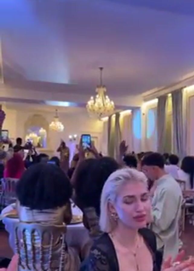 person performing on stage in a well-lit banquet hall. The hall is decorated with ornate chandeliers, paneled walls, and draped curtains. The performer, dressed in a gold patterned shirt, sings into a microphone while people in the audience record with their phones. The audience consists of diverse individuals seated at round tables, dressed formally and engaging with the performance.
