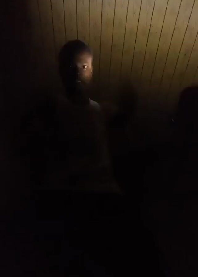 A person wearing a tank top and pants stands in a darkened space, holding a light source. The person moves and the light illuminates a paneled ceiling. The camera then focuses on the light source, obscuring everything else. The light source moves, creating a crescent shape in the darkness.
