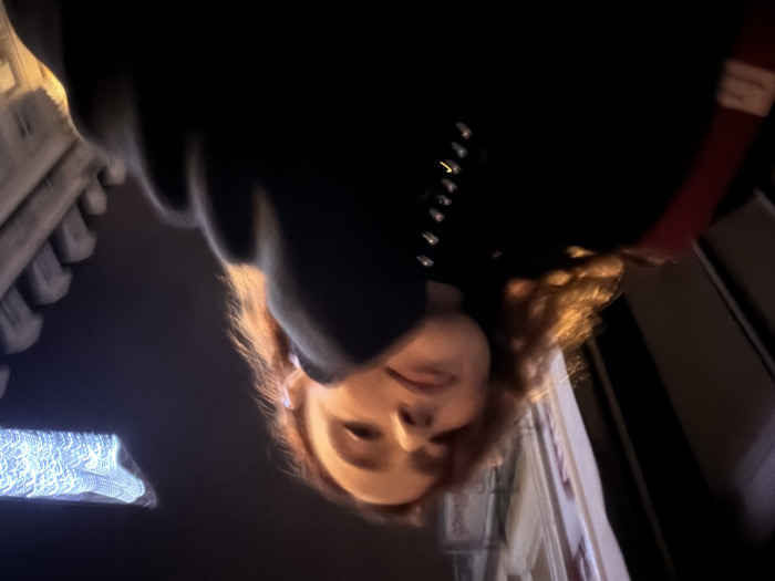 A person with red hair and fair skin is facing the camera, which is positioned above them looking down. The individual is wearing a dark-colored garment with shiny embellishments or buttons down the front. In the background, there are blurred architectural details suggestive of a city street at night, including a row of arched structures and a building facade. The lighting is dim.