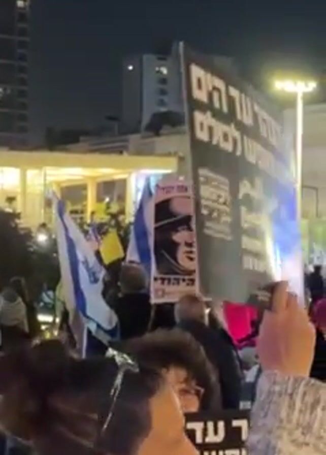 demonstration at night. People are carrying signs, some of which feature text in English, Hebrew, and Arabic. One sign prominently reads "FROM THE RIVER TO THE SEA, EVERYBODY MUST BE FREE". Some people are also carrying Israeli flags. The scene is lit by streetlights and the windows of tall buildings in the background. The camera focuses mainly on the demonstrators holding the signs.