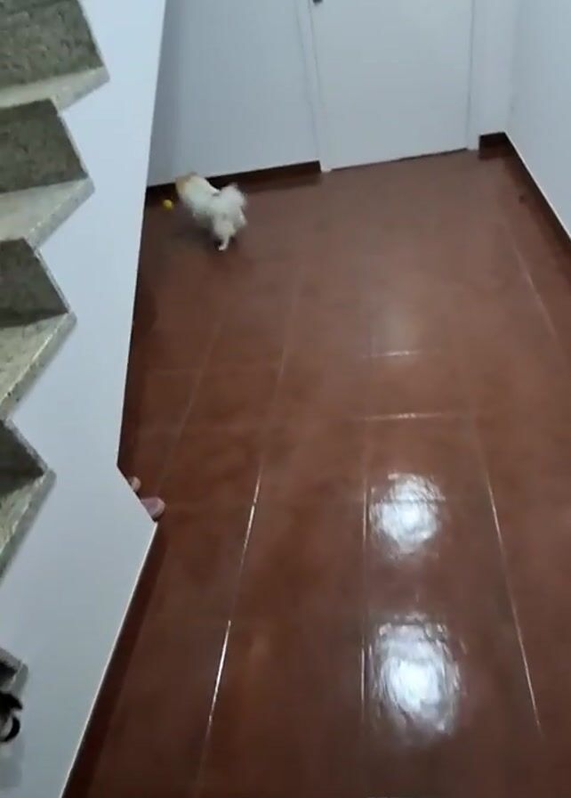 small, white dog playing with a yellow ball on a brown tile floor. The dog is moving around the room, nudging the ball with its nose. Near the dog are a pair of mauve slippers and a small multi-colored ball. The room has white walls and a white door. There is a staircase on the left side of the frame.