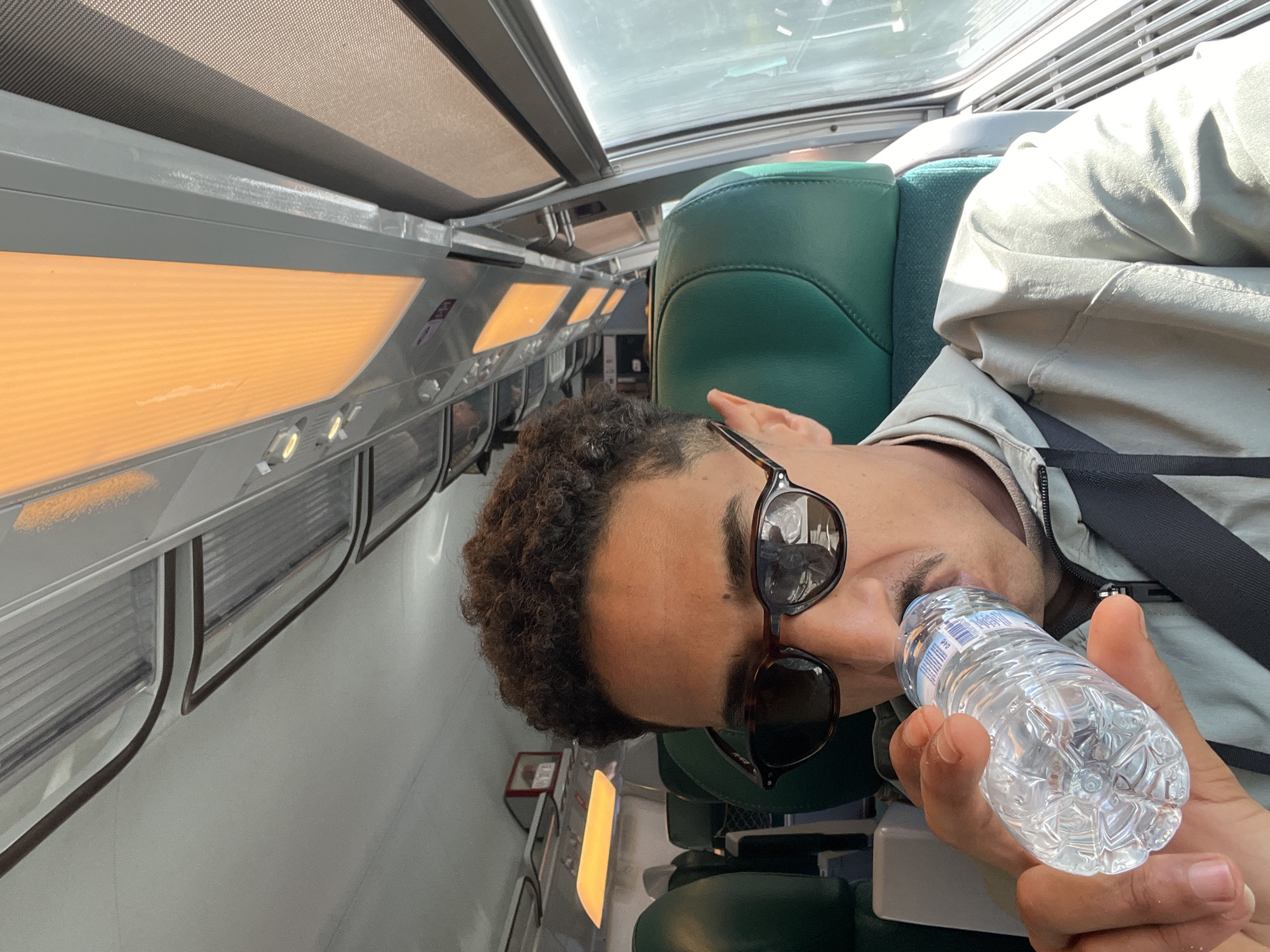The scene depicts the interior of a modern train car, likely part of the Moroccan national rail network, in transit near or through Kenitra, Morocco. The primary subject is an adult male, positioned centrally and captured from the chest up. He has curly dark hair, a visible mustache, and is wearing dark-lensed, tortoise-shell framed sunglasses. He is dressed in a light-colored jacket or hoodie over a lighter undershirt, with a dark seatbelt secured across his chest. The subject is actively drinking from a clear plastic water bottle, held to his mouth with his right hand. The train's interior features green upholstered seating, overhead luggage racks with integrated linear lighting panels, some emitting an orange glow. A window on the right side of the frame shows a blurred exterior, indicative of vehicle movement. A red emergency hammer sign is visible on the overhead paneling on the left side of the frame.
