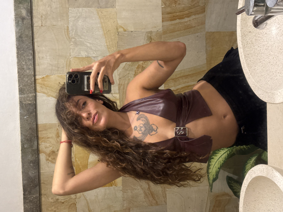 A young woman with long, curly brown hair poses for a mirror selfie in a bathroom. She wears a dark burgundy, faux leather halter top with a buckle at the center and black pants. A tattoo is visible on her chest. The bathroom features beige stone tiles and an oval sink. She holds a smartphone, displaying red manicured nails. A plant with large green leaves is reflected in the mirror.