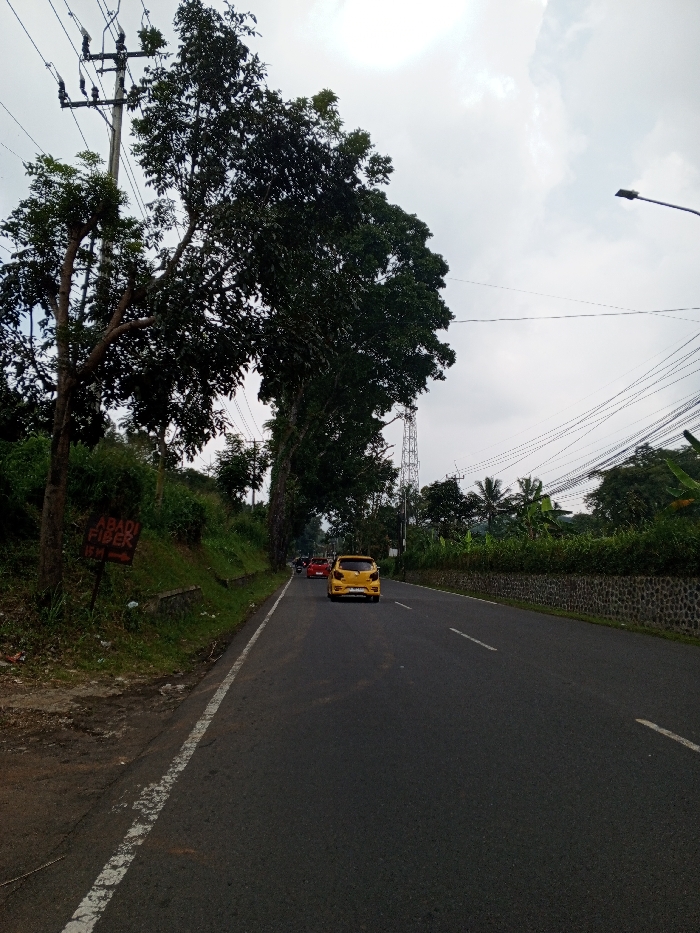 The image displays a two-lane asphalt road, presumably within the city of Multhan, India, under an overcast sky. The road runs from the foreground into the distance, with a solid white line marking its left edge and a dashed white line indicating lane separation further down. In the mid-ground, a yellow hatchback automobile is traveling away from the viewer in the right lane. Behind it, two red vehicles, possibly motorcycles or small cars, follow in the same direction. No people are visible. The left side of the road features an upward-sloping grassy embankment densely covered with trees and foliage. A rectangular wooden sign, painted red with white text reading "ABADI FIBER" and "15 M ->" with a right-pointing arrow, is positioned on this embankment in the foreground. Several large trees with dark green leaves line this side of the road. The right side of the road is bordered by a low retaining wall constructed from dark grey stones. Beyond this wall, dense green vegetation, including taller trees and broad-leafed plants, extends into the background. A street light pole with a luminaire is visible on the far right. Further in the background, a tall, metallic lattice structure, consistent with a communications tower, rises above the vegetation. Numerous overhead utility wires traverse the scene, connecting to poles, some of which are partially obscured by the tree canopy. The sky above is uniformly grey and cloudy.