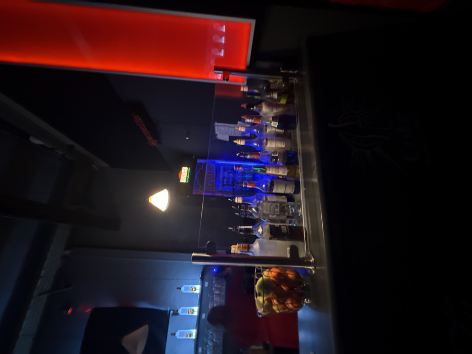 A bar with multiple alcohol bottles lined up behind a transparent partition with metal railings. Above, there is a red illuminated panel. Below, vodka bottles glow blue. A hanging basket holds oranges and apples. A lamp casts light onto the bar area. A dark figure in a red shirt stands near the bar, seemingly engaging with it.