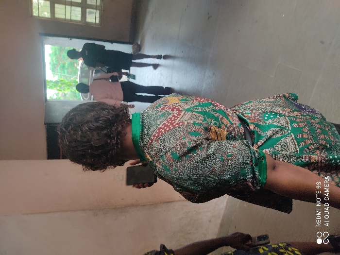 Inside a building, a woman with short, dark, curly hair wears a green and red patterned shirt. She holds a black phone. Behind her, two figures stand near an open doorway leading to an outdoor scene with greenery. One figure wears a black outfit, and the other wears a light pink shirt. The room has light-colored walls and a window is visible.