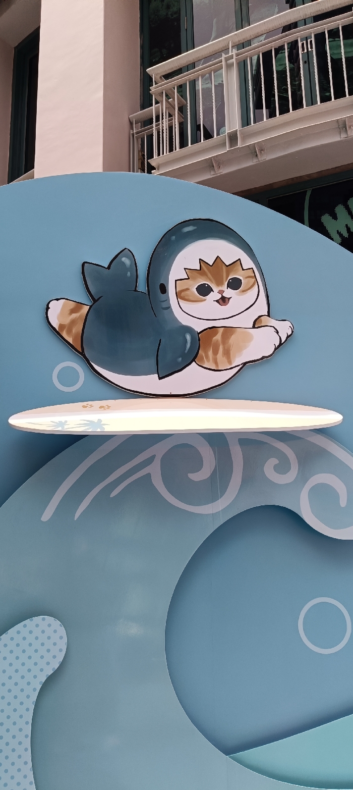 A cartoon image shows a light brown cat wearing a dark blue shark costume, positioned above a white surfboard
