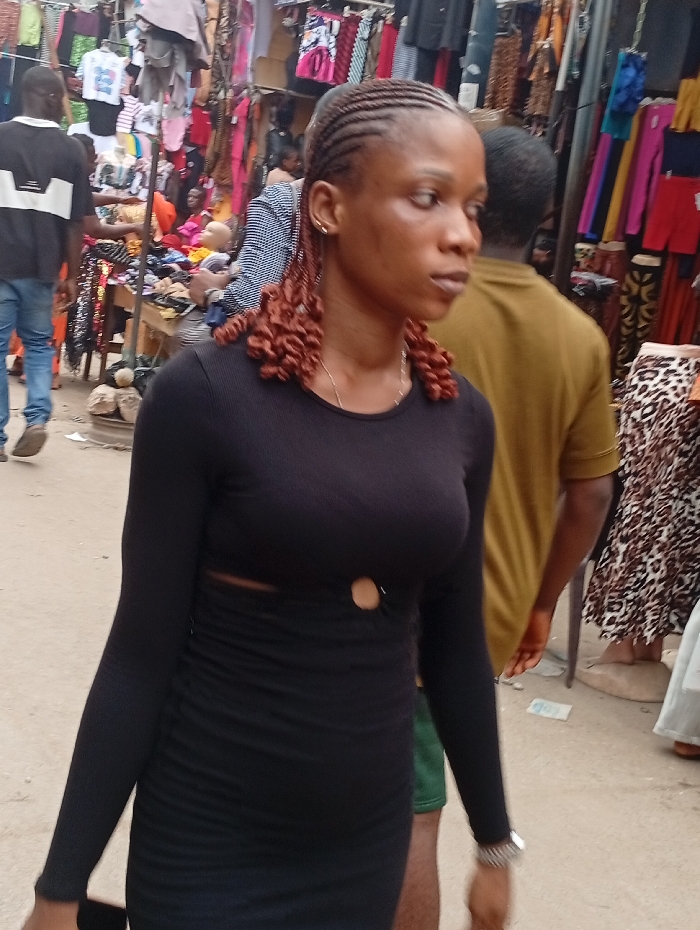 A woman in a fitted black dress with long sleeves and side cut-outs is walking through an outdoor market. She has cornrows that end in reddish-brown curls. Various vendors display clothing items, including t-shirts, dresses, and pants. People mill about, some in casual attire like jeans and t-shirts, others in printed fabrics. The scene appears busy and crowded with a variety of textures and colors from the merchandise and the surrounding environment.