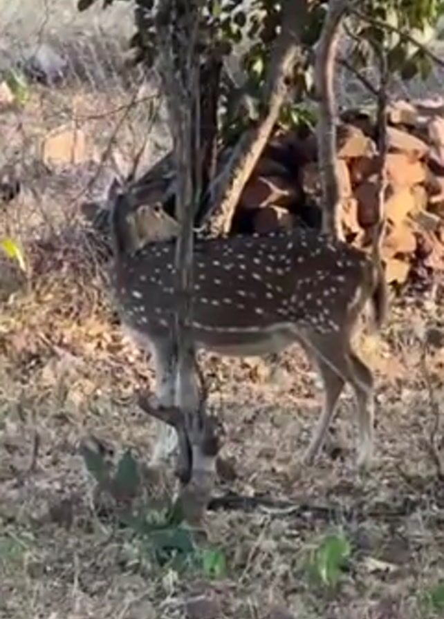 - "spotted deer standing behind a thin tree in a dry, wooded area" by FM-8gHP13, licensed under CC BY 4.0