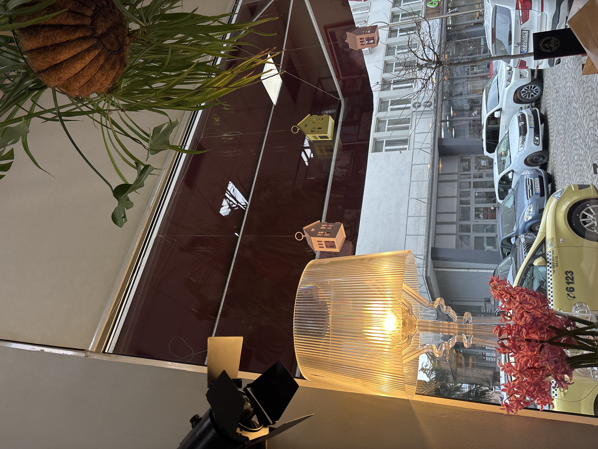 Here is a detailed description of the image: **General Scene:** The photograph appears to have been taken from inside a café or restaurant, looking out through a window. The window provides a view of a street scene in what is speculated to be Stara Zagora, Bulgaria. **Objects and Details in the Interior:** * **Hanging Plant:** In the upper-left corner, there is a hanging plant with long, green foliage and a brown, coconut-fiber planter. * **Window Décor:** A series of small, house-shaped ornaments hang by thin strings against a burgundy awning. There are at least three house ornaments in view. * **Table Lamp:** A translucent, cylindrical table lamp with a visible light source shines brightly near the bottom right. * **Candle:** A white candle sits to the left of the lamp. * **Professional Light:** A black professional studio light is set up to the left of the candle, for video or photography. * **Flowers:** A bouquet of pink flowers in a vase is present on the window sill, near the edge of the frame. **Exterior Scene (View Through the Window):** * **Street:** A street scene is visible, with vehicles parked along the side. * **Vehicles:** There is a line of parked cars, including white, blue, and yellow vehicles. The yellow vehicle has markings indicating it's a taxi. The vehicle license plates include "CT 9193 PC", "087389MC", and "CT 2255 PK". * **Building:** Across the street, a large building with many windows can be seen. * **Tree:** A tree with bare branches is in the scene. **Overall Impression:** The scene has a cozy, interior setting juxtaposed against a busy street scene. The objects are arranged in a way that suggests a curated and deliberate aesthetic.